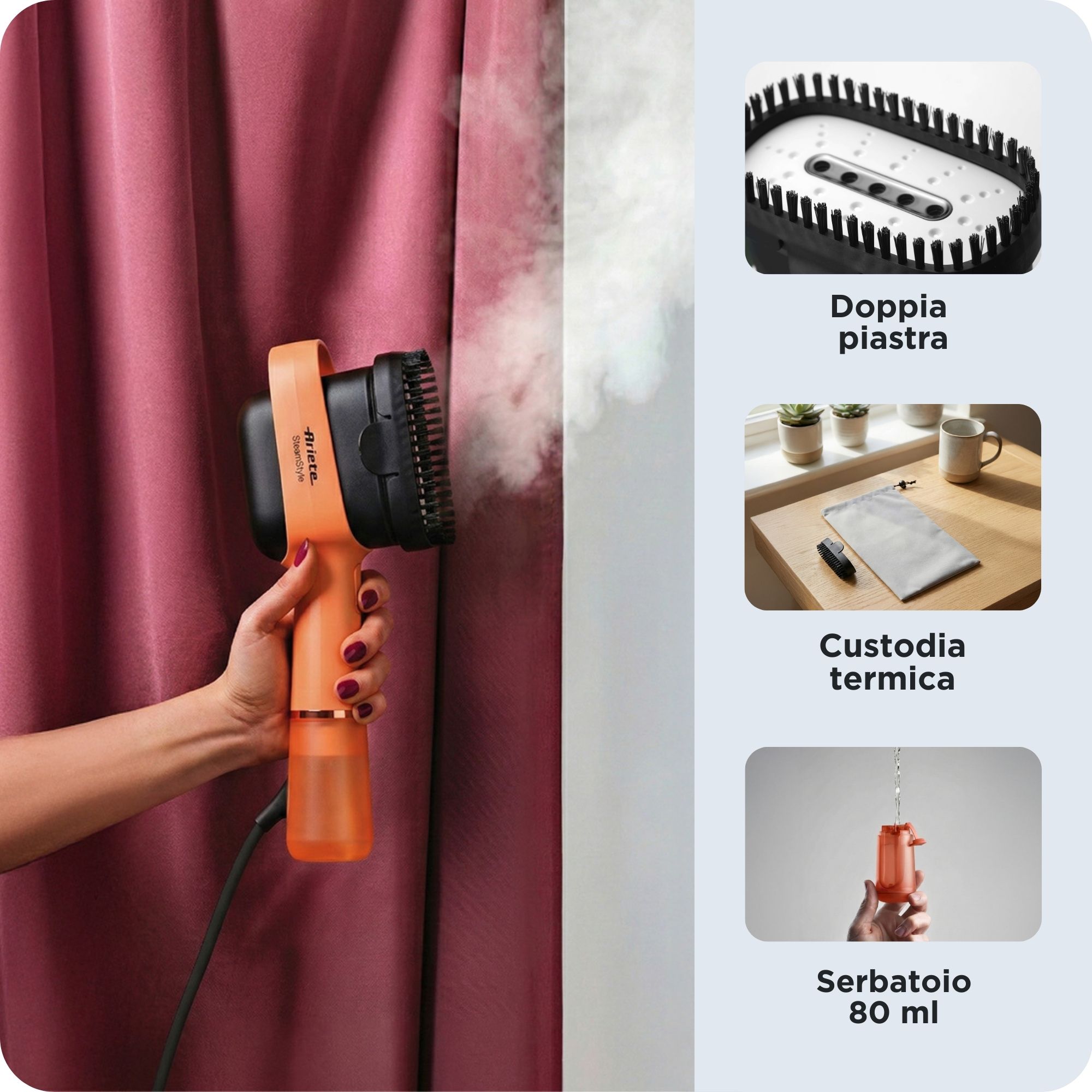 Pensata per chi vive in movimento è completa di una pratica spazzola rimuovi pelucchi (removibile con un click e adatta a tessuti più “spessi”) e una sacca resistente al calore per riporla subito dopo l'uso sia in borsa che in casa