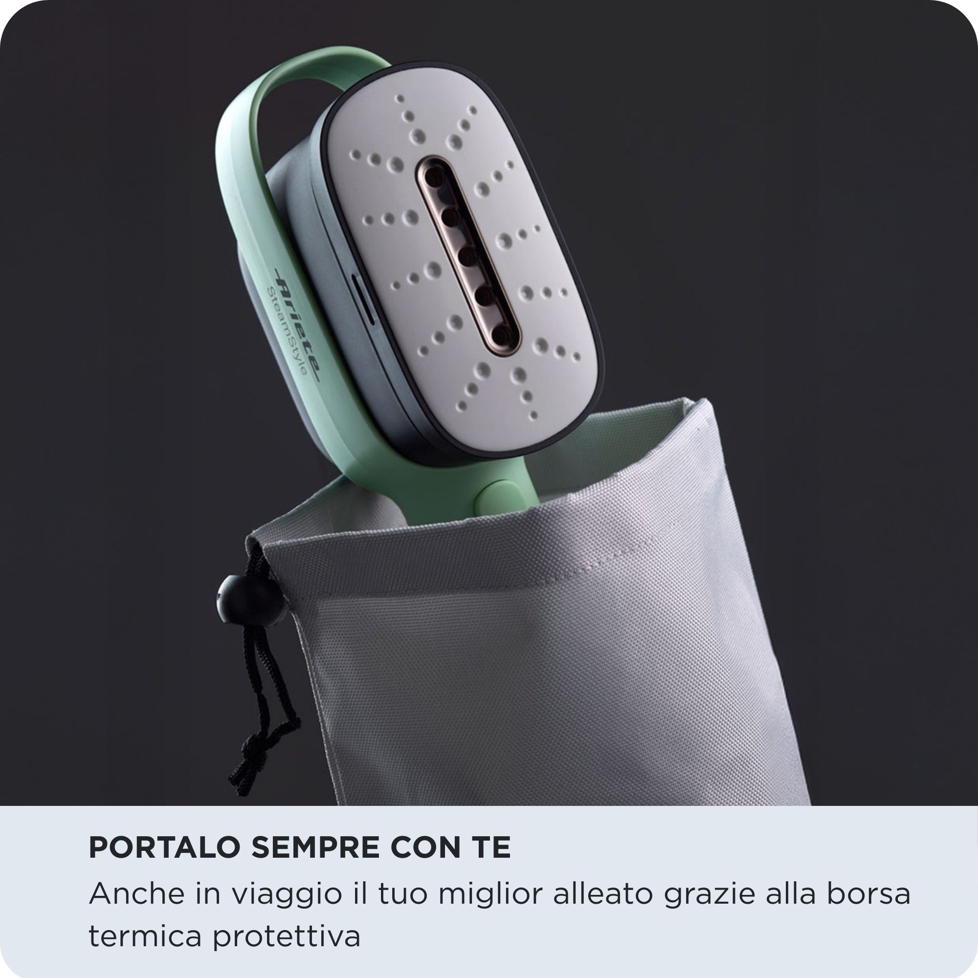 Pensata per chi vive in movimento è completa di una pratica spazzola rimuovi pelucchi (removibile con un click e adatta a tessuti più “spessi”) e una sacca resistente al calore per riporla subito dopo l'uso sia in borsa che in casa