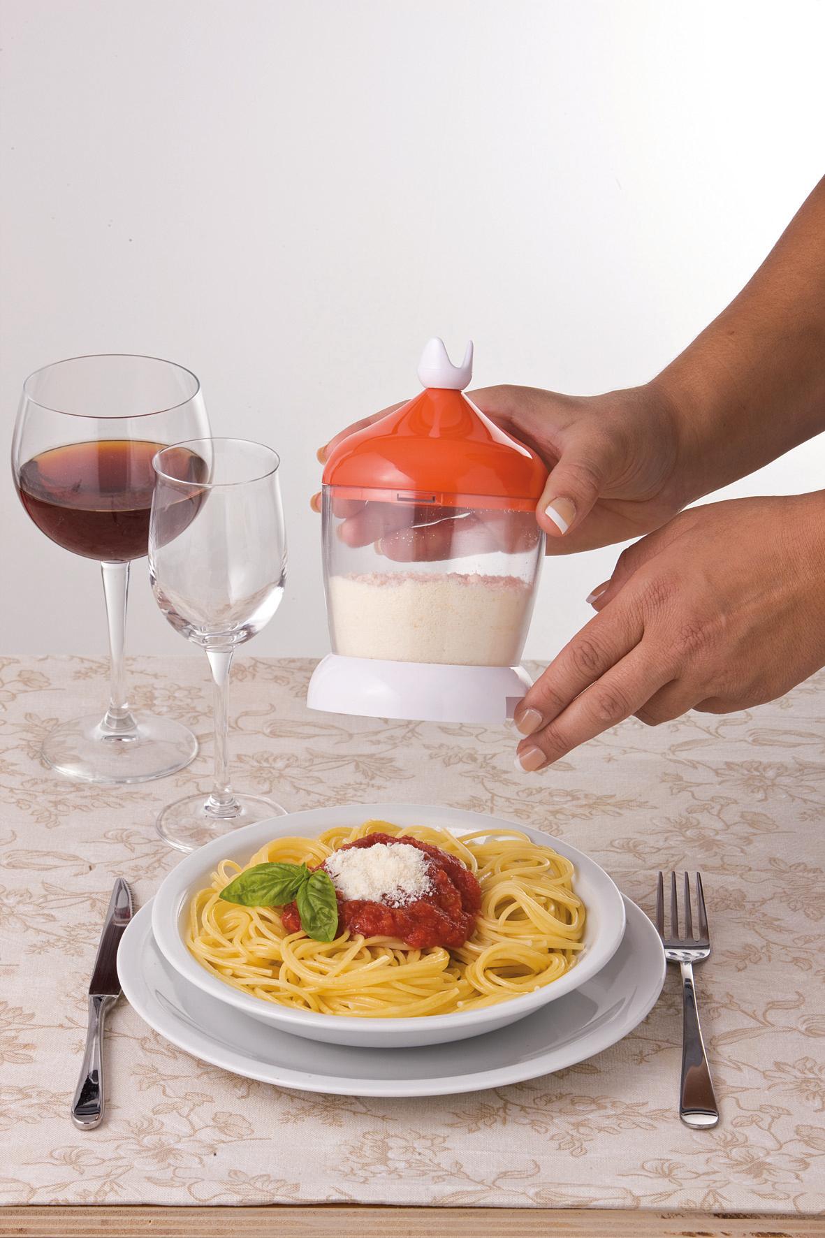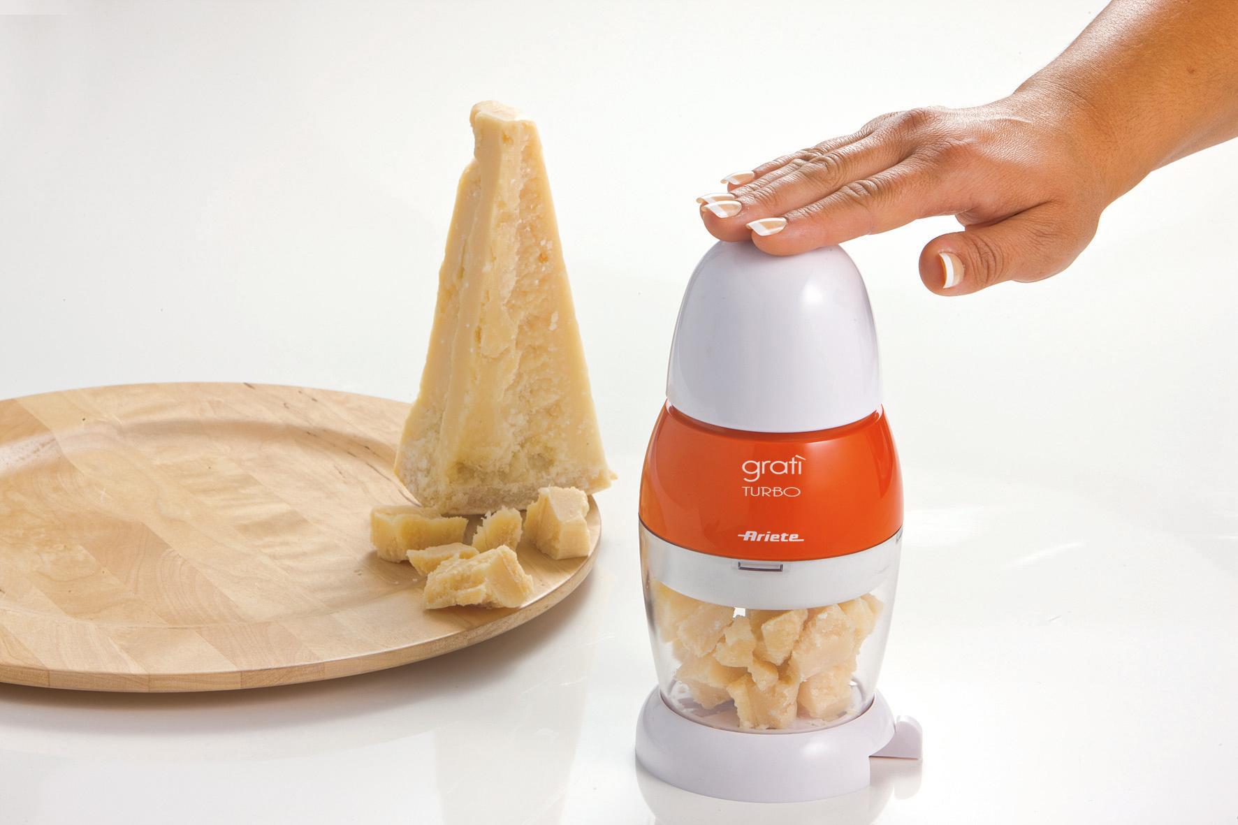Gratì Turbo è la grattugia elettrica che si trasforma in comoda formaggiera con dosatore utilizzando l'apposito coperchio salvafreschezza. Puoi versarlo direttamente nel piatto e riporlo comodamente in frigorifero.