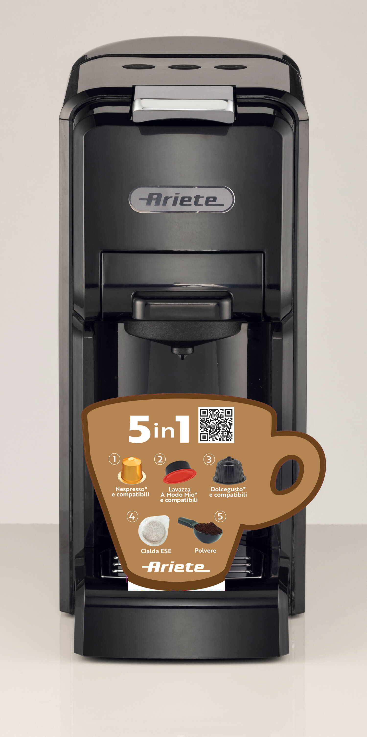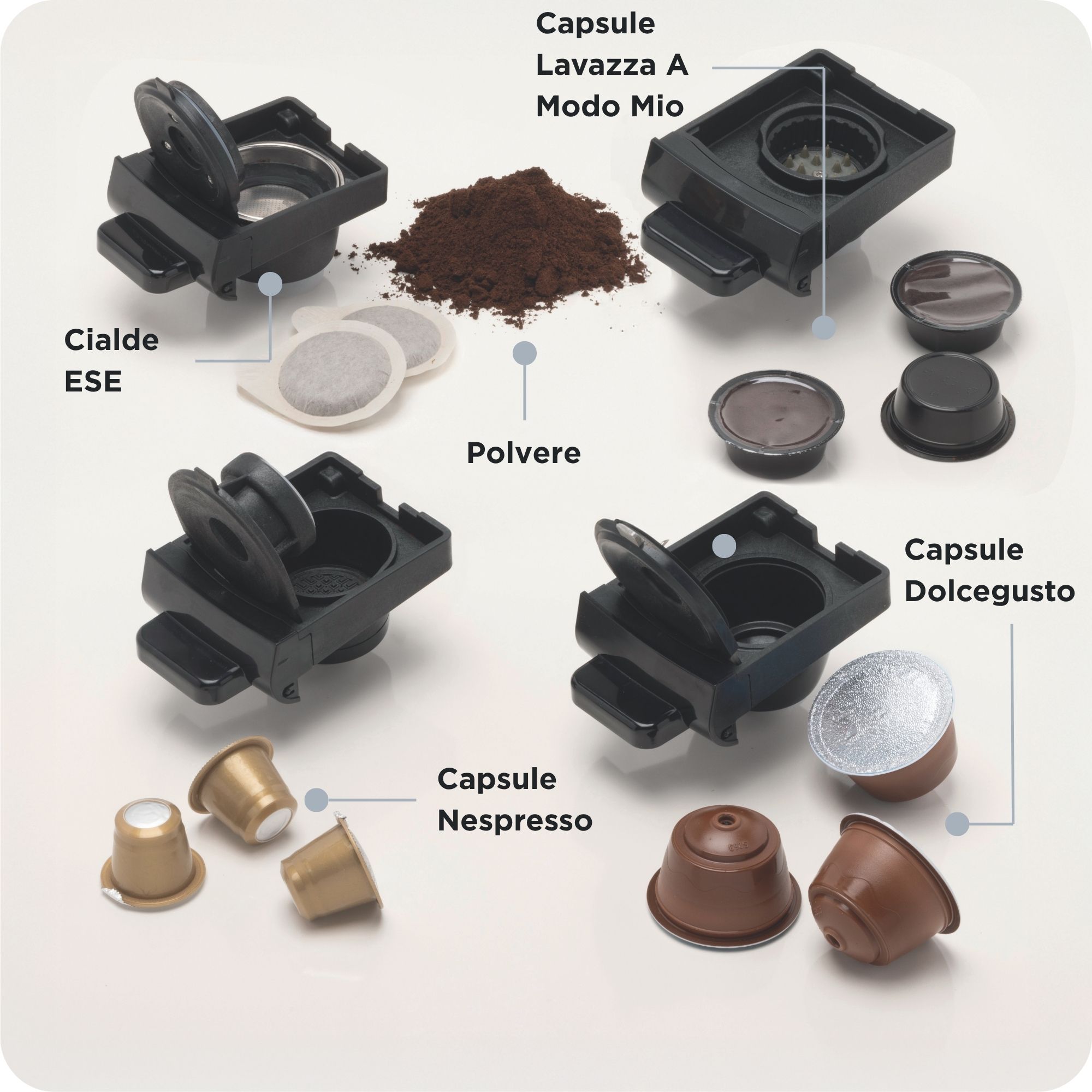 | Tipologia di caffè | capsule Nespresso*, Dolcegusto* e Lavazza A Modo Mio*, cialde ESE e polvere |