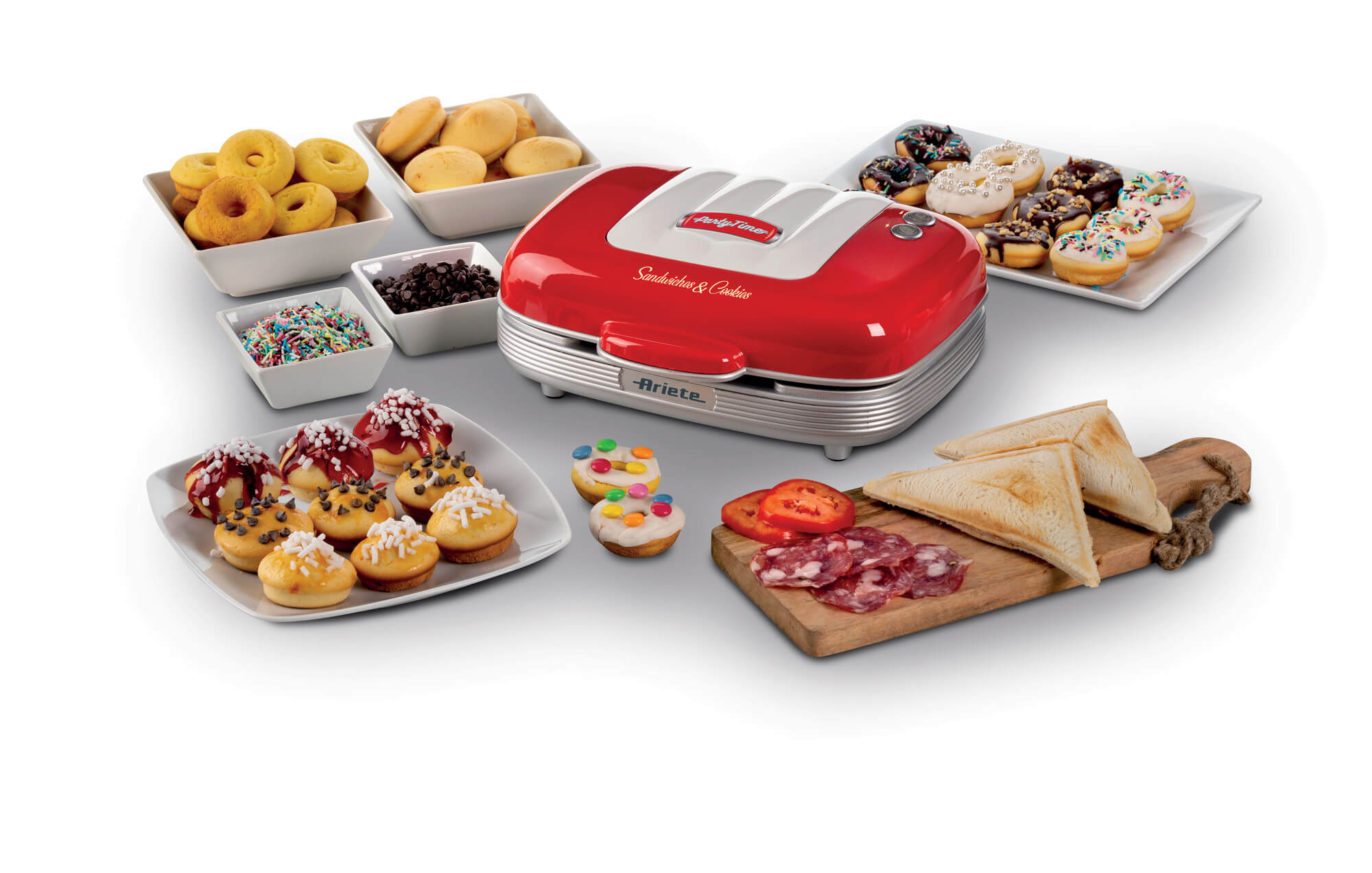 Piastra Elettrica Multifunzione per muffin, donuts e sandwiches, con design unico degli American Diner anni ‘50. Ideale per preparare merende dolci e salate con allegria. Let’s party con Party Time Ariete!