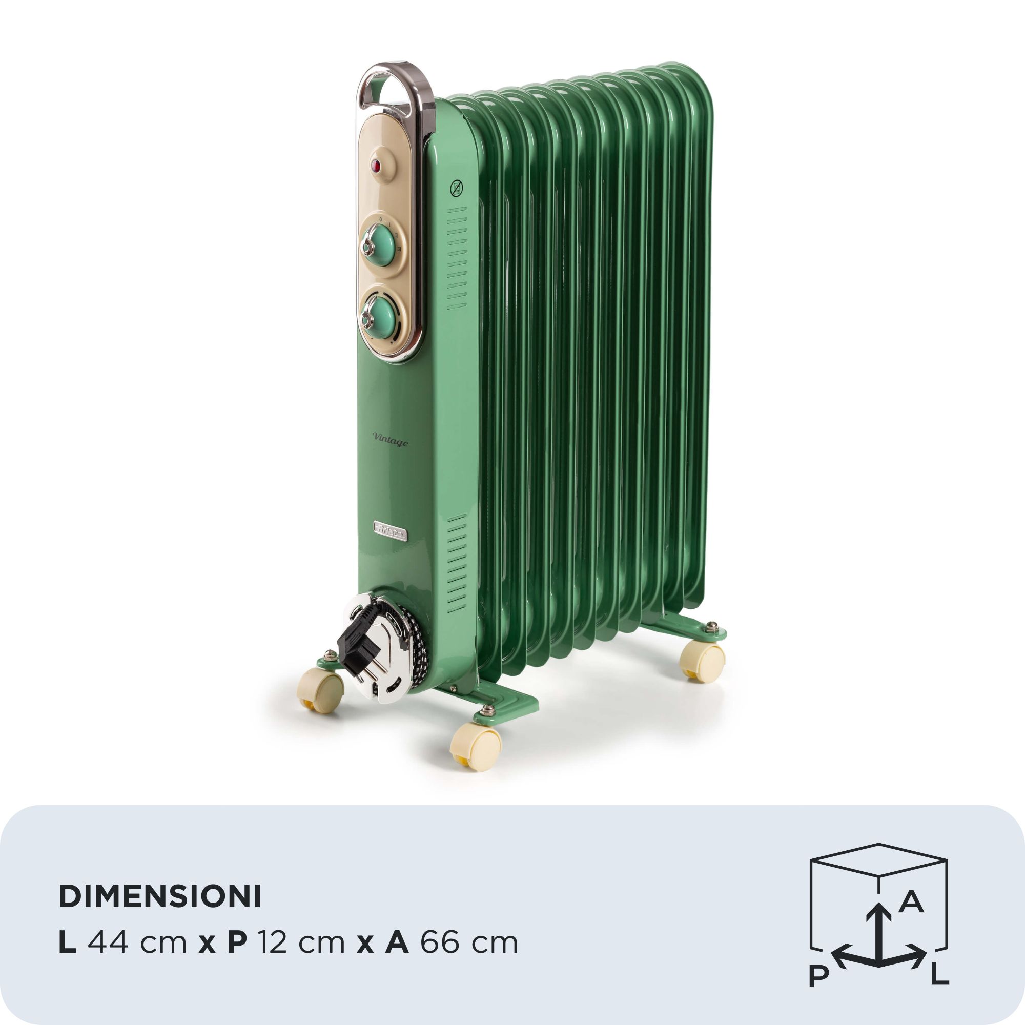 Il radiatore a olio Vintage è compatto e maneggevole, ideato appositamente per i più freddolosi che vogliono portarlo con sé in ogni stanza della casa, dal bagno alla camera da letto, grazie alla pratica maniglia e alle 4 ruote girevoli a 360°.