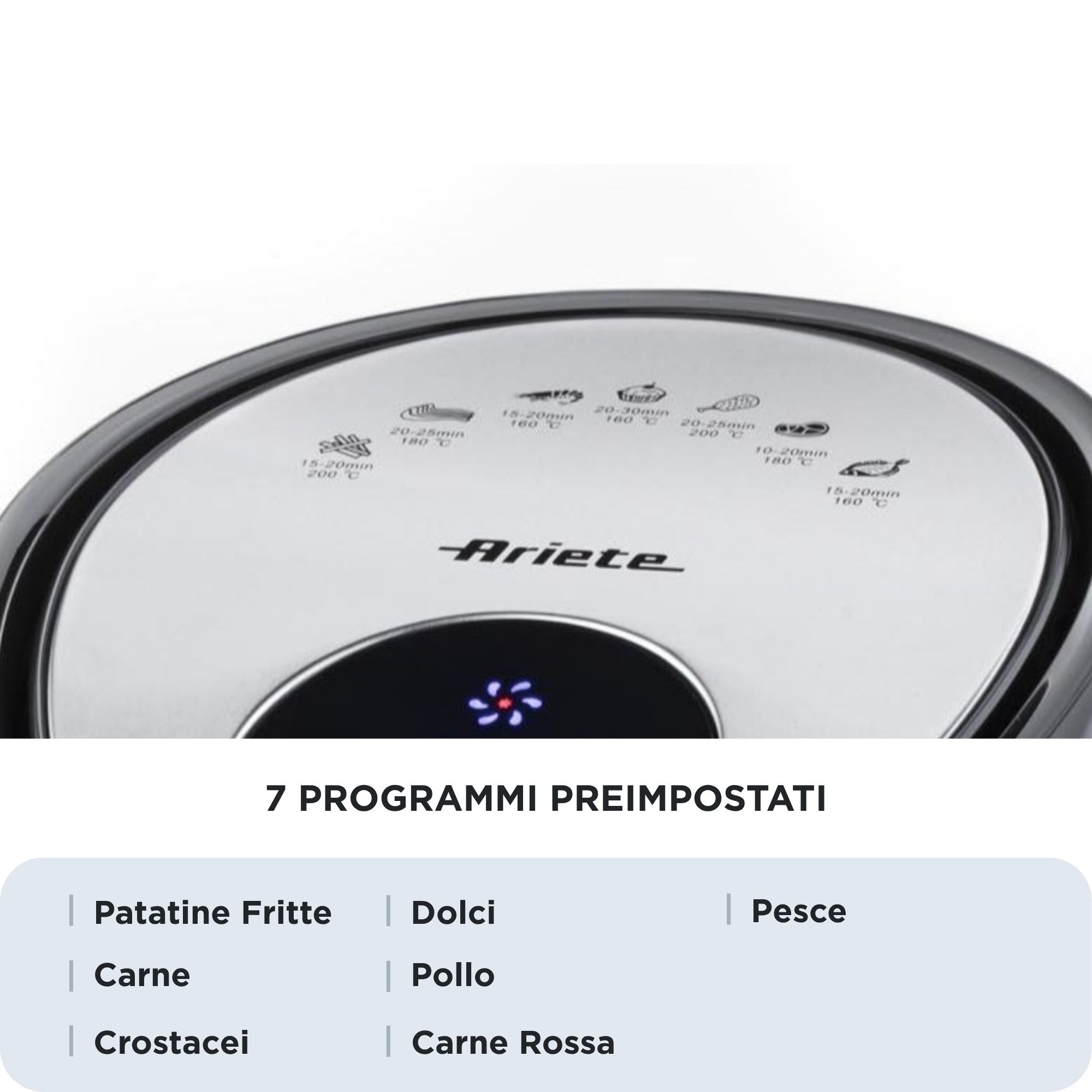 Con la friggitrice ad aria grande Airy Fryer XXL di Ariete puoi friggere qualsiasi pietanza, anche in grande quantità, utilizzando un solo cucchiaio di olio per ottenere fritture sane e gustose allo stesso tempo. Grazie al cestello XXL da 7 litri con Airy Fryer XXL di Ariete potrai cuocere fino a 2,5 kg di patatine fritte in una sola volta! Patatine fritte, ma non solo, anche crocchette, pesce, carne e tanti altri alimenti impanati, sia surgelati e pronti da friggere, che freschi e appena impanati, grazie alle 7 modalità di cottura preimpostata.