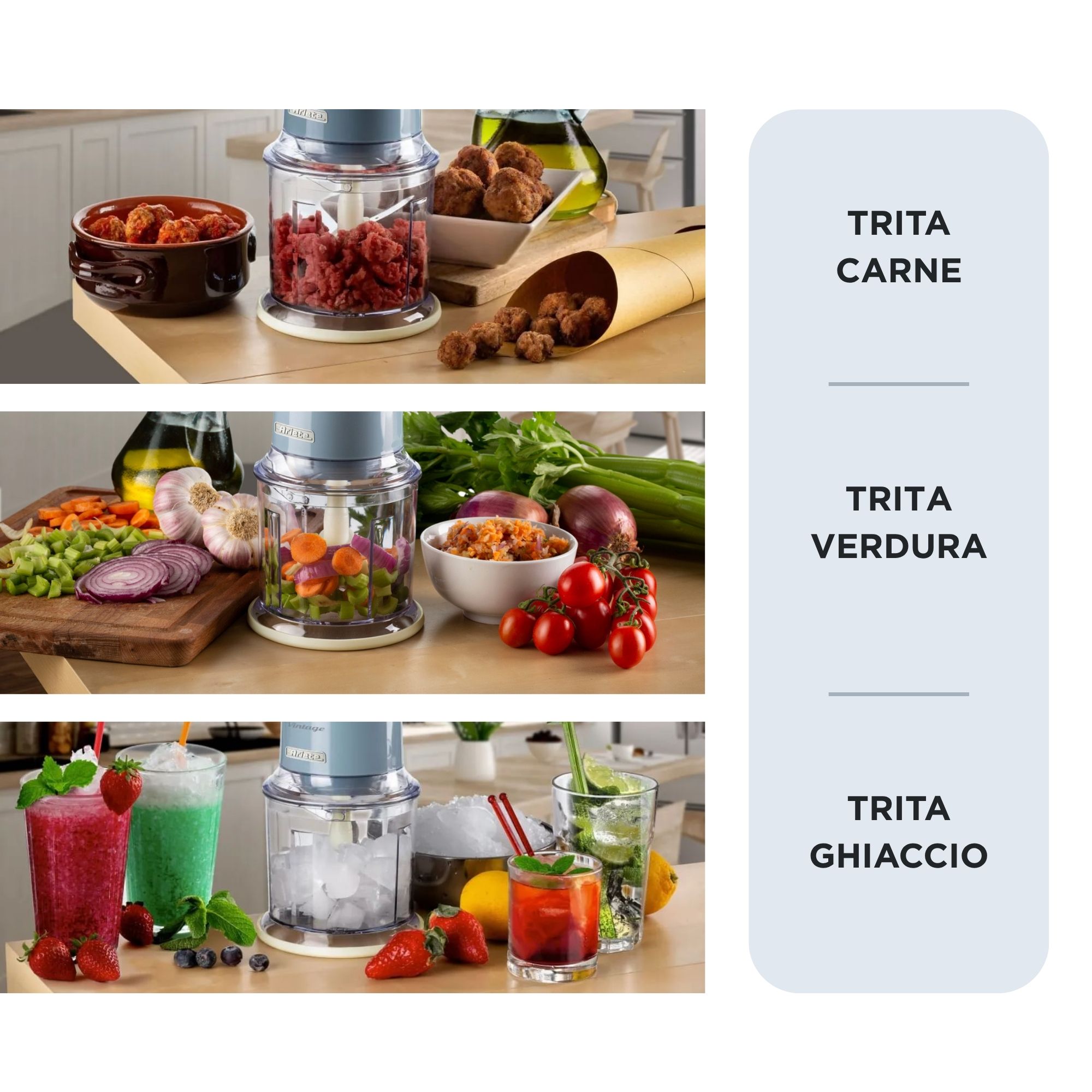 La Linea Vintage di Ariete si arricchisce di un prodotto indispensabile per le tue ricette in cucina: un tritatutto elettrico dalle linee retrò e dai tenui colori pastello, perfetto per portare un tocco di stile e funzionalità nella tua cucina. Grazie alla sua potenza di 400 Watt e alle 4 lame in Acciaio Inox, il Chopper Vintage ti consente di tritare qualsiasi ingrediente per le tue ricette: dalle verdure alla carne, formaggio, pane, frutta secca e perfino al ghiaccio. Le 2 velocità, azionabili con i due pulsanti posti sulla sommità del Tritatutto, ti permettono di sminuzzare o tritare finemente gli alimenti, mentre I piedini antiscivolo ti assicurano la massima adesione del prodotto al piano di lavoro.