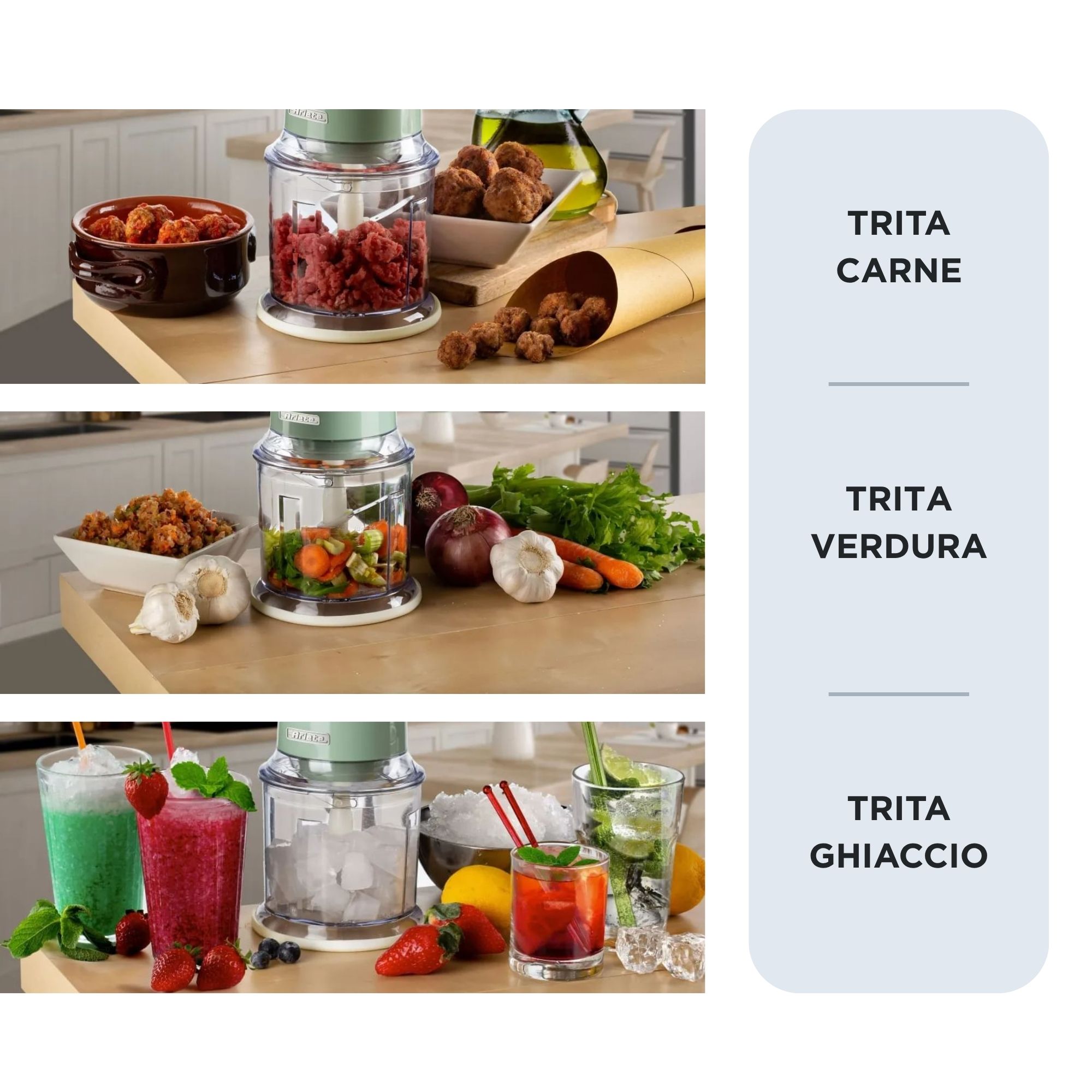 Tritatutto a 2 velocità, 2 pulsanti e 4 lame in Acciaio Inox. Tritaverdure e Tritaghiaccio. Tazza graduata da 600ml.
